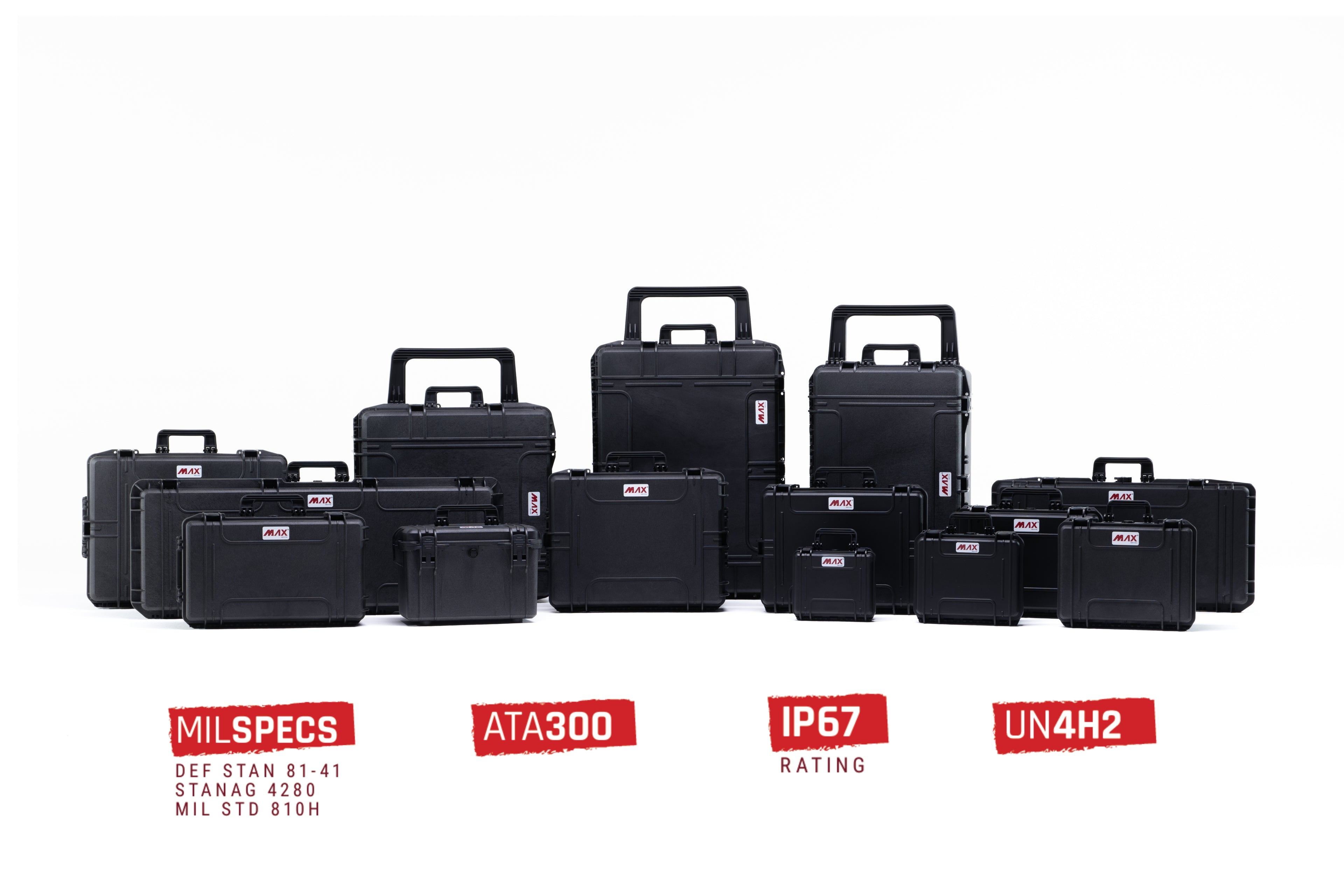 MAX cases by Panaro are built to professional standards. Every case is IP67 certified — meaning fully dustproof and waterproof up to 1 meter — and meets MIL-STD-810 and STANAG 4280 military standards. Made from impact-resistant polypropylene with an automatic pressure relief valve, they protect your equipment even in the harshest conditions.